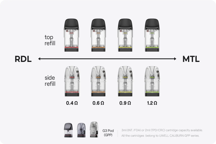 این کارتریج ها دارای کویل های داخلی و یکپارچه و توری هستند که در دو سطح از مقاومت 0.6 اهم و 0.9 اهم از حالت ویپینگ MTL و RDL پشتیبانی می کنند.
