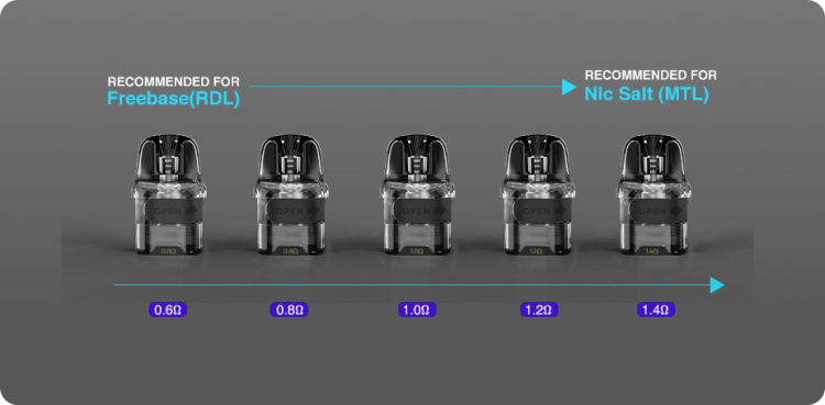 این کارتریج برای استفاده از سالت نیکوتین ها با 3 مقاومت اهم متفاوت ۰.۶ ، ۰.۸ و ۱.۰ اهم تولید می شود.