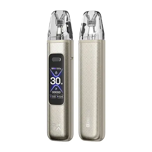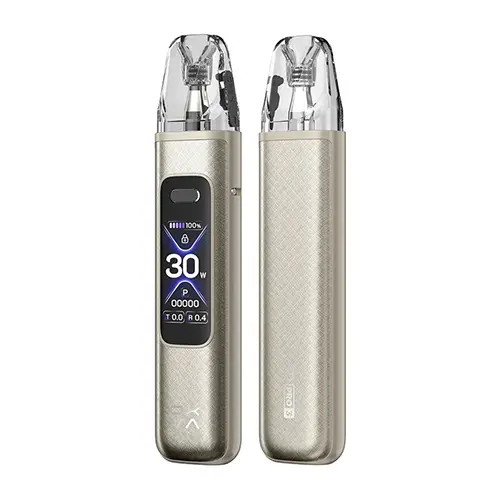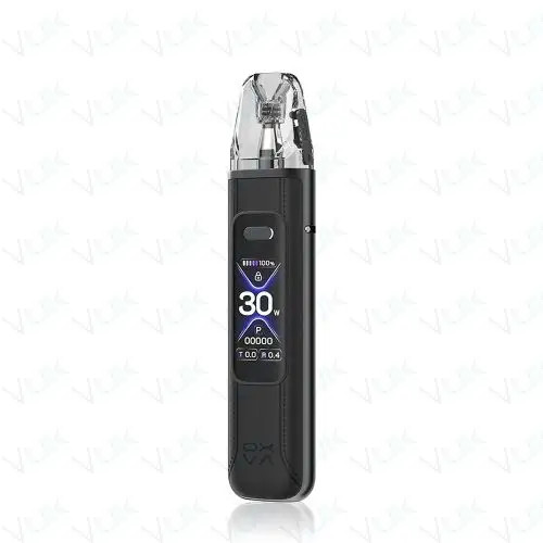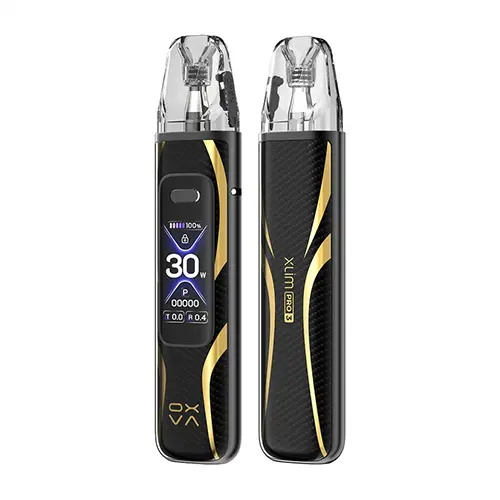 OXVA Xlim Pro 3 با روکش مشکی و طلایی با صفحه نمایش که خروجی 30 وات و 100٪ باتری را نشان میدهد.