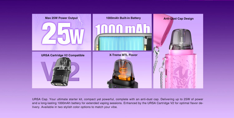 پاد جیبی اورسا کپ دارای باتری 1000 میلی امپری با خروجی 25 وات تعادلی مناسب بین قدرت و کارایی دارد. این دستگاه دارای یک درپوش جذاب است که از ورود گرد و غبار به داخل دهانی کارتریج جلوگیری میکند و همچنین زیبایی بصری این مدل آنرا به یک پاد خاص تبدیل میکند طوری که انگار یک رژلب جذاب در جیب خود دارید.